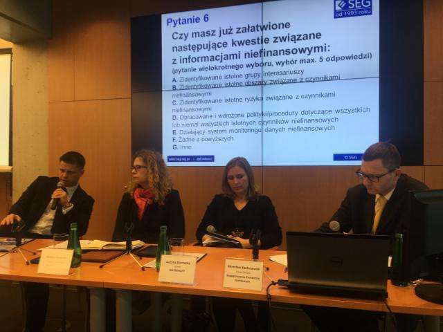 Podczas spotkania omówiliśmy między innymi zakres i stan prac nad implementacją Dyrektywy 2014/95/UE, kto podlega nowym obowiązkom w zakresie raportowania oraz co powinno zawierać sprawozdanie w sprawie informacji niefinansowych. Zastanowiliśmy się również, na bazie 10-letniego doświadczenia, jak się przygotować i na co zwracać uwagę podczas raportowania informacji niefinansowych. W dalszej części konferencji dyskutowane były zagadnienia związane z wyborem odpowiedniego standardu raportowania, identyfikacją ryzyka i badaniem istotności oraz nadzorem nad raportowaniem informacji niefinansowych.