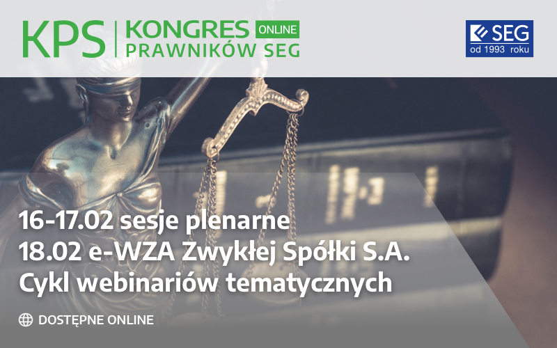 Stowarzyszenie Emitentów Giełdowych miało przyjemność zaprosić na 12. edycję Kongresu Prawników Spółek Giełdowych SEG, który w tym roku wyjątkowo odbył się tylko w wersji online. Podczas e-KPS zaplanowaliśmy dla Państwa 3 dni sesji plenarnych, w tym 16-17 lutego debaty z zaproszonymi ekspertami oraz 18 lutego e-WZA Zwykłej Spółki S.A. W dniach 23 lutego-9 marca odbędzie się cykl webinariów tematycznych e-KPS.